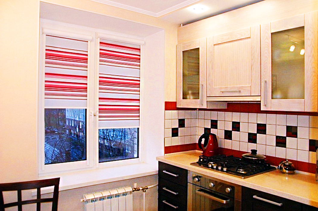 Отличным выбором для кухонного окна будут рулонные шторы. В отличии от традиционных штор и тюли, рулонные шторы освобождают зону подоконника, которой обычно не хватает на кухне. Основным плюсом рулонных штор на кухне можно отметить безопасны при близком расположении газовой плиты возле окна. Рулонные шторы надежно закрепляются к окну тем самым делают невозможным попадание материала на кухонную плиту.
